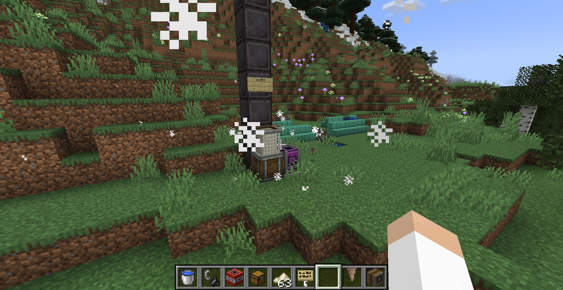 몹이나 아이템을 띄우거나 움직이게 할 수 있는 것도 다들 아실텐데요, 떨어지는 모래나 화살, 떨어지는 모루 등도 영향을 받습니다. 아래 스크린숏에서 표지판은 64 RPM, 128 RPM, 256 RPM으로 바람을 내뿜을 때 띄워지는 높이를 표시한 것입니다.