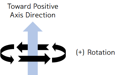 그 전에 몇 가지 알아둬야 할 사실이 있습니다. 먼저 Minecraft에서 +x, +y, +z 방향은 각각 동쪽, 위쪽, 남쪽과 연결됩니다. 그리고 각 회전하는 물체는 한 쪽에서 보면 시계 방향이고, 반대 쪽에서 보면 반시계 방향으로 돕니다. 이러한 모호성을 해결하기 위해 Create에서 회전하는 물체를 회전 축(x, y, z)과 회전 속도의 부호로 기술할 수 있다고 해봅시다. 이 때 부호는 편의상 아래와 같이 결정하겠습니다. (오른손의 엄지를 위로 했을 때 손목이 뒤로 꺽이지 않게 휘감는 방향입니다.)