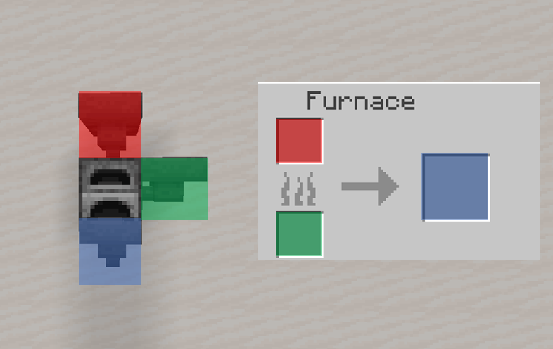 이 때 아이템 공급하는 게 약간 번거롭습니다. 구울 아이템, 태울 아이템을 함께 공급하고 구운 아이템은 밖으로 꺼내야 하기 때문입니다. 아래는 화로의 각 면이 어떤 아이템 칸과 연결되어 있는지를 보여주는 그림입니다.