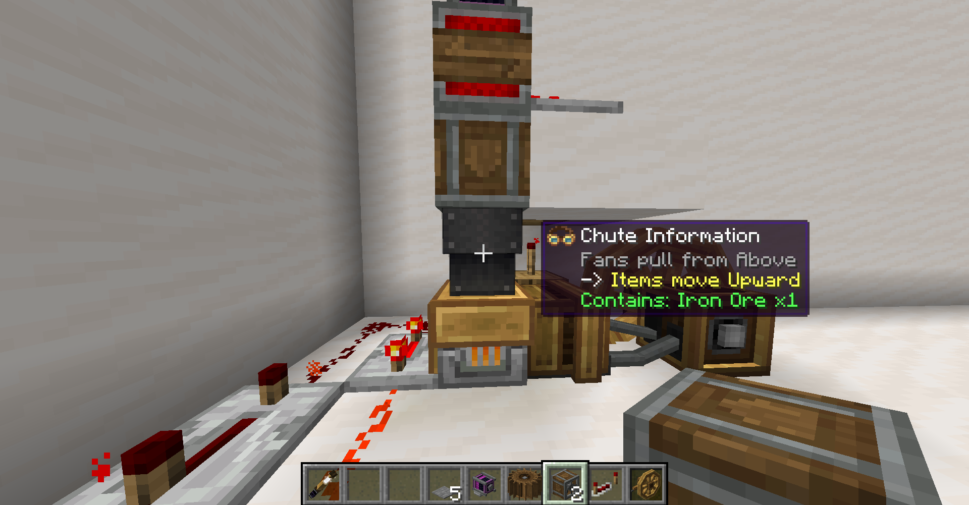 이 부분을 회피하고자 다음과 같은 장치를 만들어 볼수도 있습니다. Blast Furnace를 쓰고 철광석 등을 하나만 넣었다 빼면서 계속 돌아가게 하는 겁니다. 물론 연료는 공급해야 하지만, 구울 아이템을 공급할 필요가 없어집니다. 필요한 건 Chute(아이템 입출력)와 레드스톤 반복 회로, Gearshift (방향 전환), Encased Fan (아이템을 위로 올리기 위해) 뿐입니다. 이렇게 할 수 있는 이유는 화로가 켜졌는 지만을 체크하기 때문입니다.