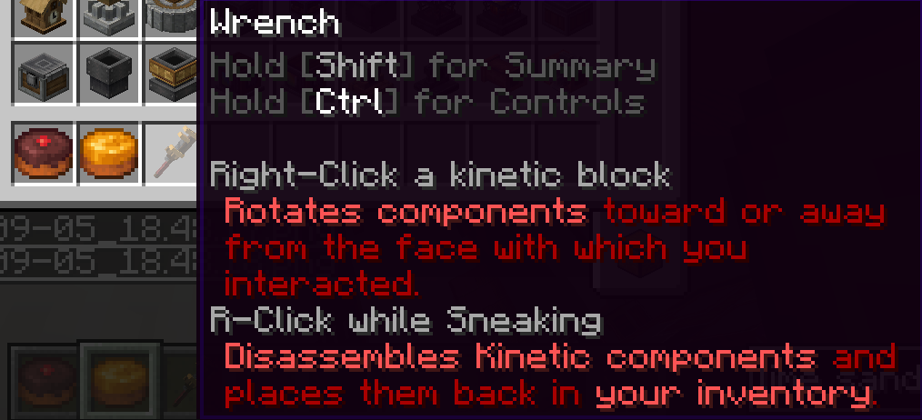회전의 경우 우클릭한 면에서 시계 방향으로 블록이 90° 회전합니다. 단 Deployer 등의 경우 특정 면에서는 우클릭이 모드 변경으로 작동합니다. 세부 사항 설정의 경우 렌치를 블록에 가져다 대면 흰 테두리로 영역이 표시됩니다. 그 영역 안에서 스크롤을 통해 모드 변경이 가능합니다. 철거의 경우 해당 블록을 철거하는 데요, Shaft에 Casing블록을 우클릭해서 Encased Shaft로 만든 경우 (Casing은 소모되지 않음) Casing 부분만 철거됩니다.