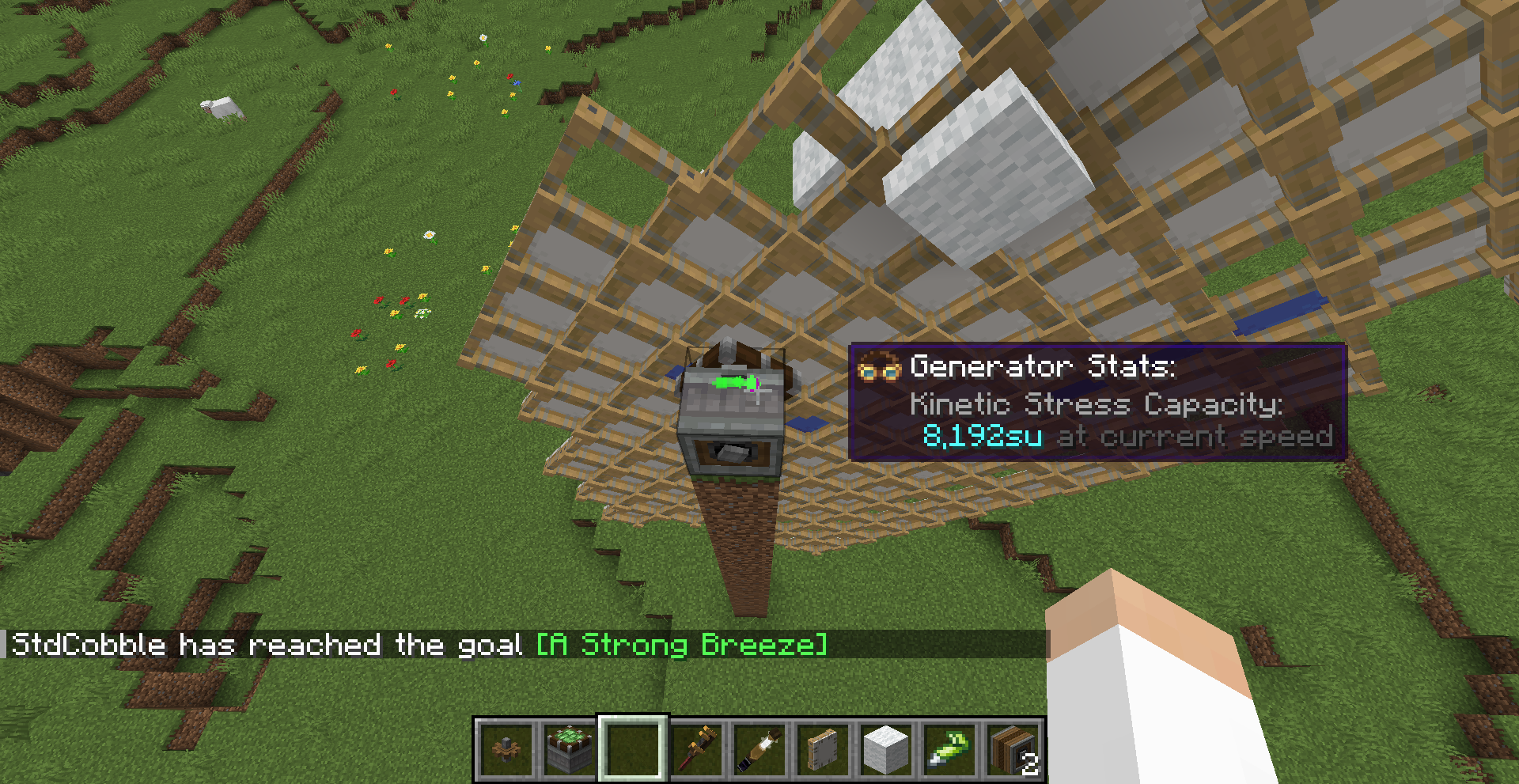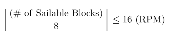 Windmill Bearing을 이용한 풍차는 양털이나 Sail Block (frame도 상관없음) 개수에 비례해서 속도가 결정되며, Stress Capacity이 512 SU/RPM입니다. 최대 16 RPM 회전이 가능하며 회전 속도는 아래 식에 의해 결정됩니다.