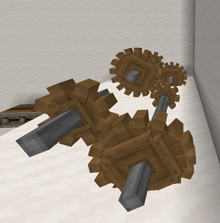 초반에 구하기 힘든 Brass가 들어가는 장치이기에, 간단하게 속도를 2배씩 바꾸는 용도라면 큰 기어에 작은 기어를 연결하는게 더 좋습니다. 아래는 주어진 16 RPM을 128 RPM으로 바꿔주는 기어 장치입니다. (뒤에 모터가 연결되어 있습니다.)